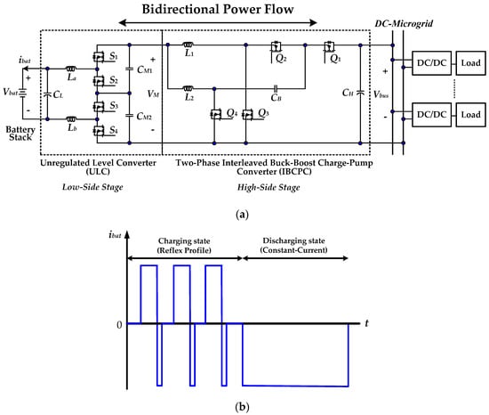 The proposed high-gain reflex-charging-based bidirectional DC charger (RC-BDC): (a) circuit topology [20], (b) battery current waveforms in charging and discharging states.