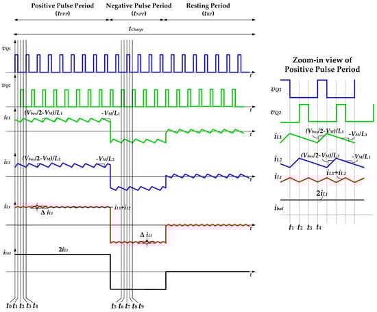 The battery current waveforms of the proposed RC-BDC are shown in Figure 1b and Figure 2. Figure 1b shows that the reflex-charging control strategy is used to charge the battery, where battery is rapidly charged during positive pulse periods (PPP) and are followed by NPPs when battery energy is returned to the DC-bus. The purpose of adding a negative pulse after the PPP is to reduce the generation of bubbles and excessive pressure inside the battery, as well as to suppress the influence of impurities attached on the electrode plates during the chemical reaction. Finishing both the PPP and NPP is considered to be a complete cycle. A sufficient resting period (RP) is given after each cycle and this is the time when electrolytic solution is diffused and neutralized. Due to this, the conversion efficiency from electrical to chemical energy is enhanced and battery temperature rise is limited, further increasing the battery lifetime. The proposed RC-BDC is also able to return battery energy to the DC-microgrid by reversing the power flow in a constant-current manner; the discharging capability of the converter.