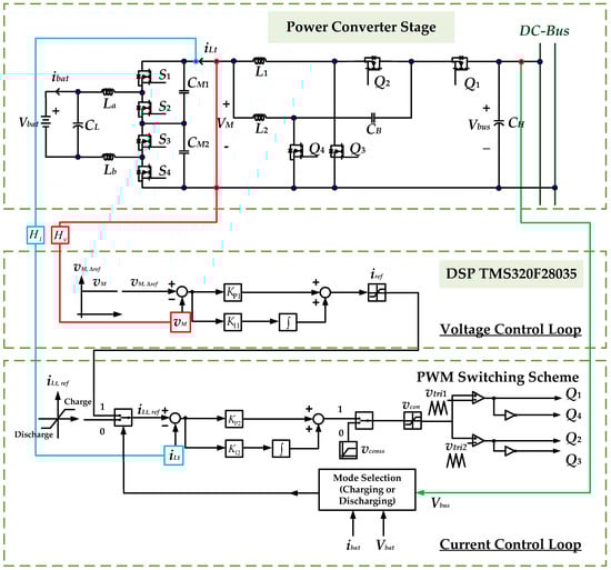 The converter topology of the proposed RC-BDC is shown in Figure 1a [20,21], where Vbus and Vbat are the DC-bus voltage and battery voltage on the high and low sides, respectively; iL1 and iL2 are the phase currents of the interleaved charge-pump converter (IBCPC), and iLt is the sum of iL1 and iL2; CB is the charge-pump capacitance; CH and CL denote the capacitance on the high and low sides, respectively; Q1–Q4 and S1–S4 are the power switches of the IBCPC and the unregulated level converter (ULC), respectively; D denotes the active switch duty cycle of the charging and discharging states; La and Lb are the high-frequency filtering inductance; and, CM1, CM2 are DC-link capacitors. The ULC charges and discharges the battery with a conversion ratio of 2:1 (voltage-dividing) and 1:2 (voltage doubling). The IBCPC is used for bidirectional power flow control at high voltage conversion ratios (i.e., high-voltage 380 ± 20 V; low-voltage: 44–56 V).