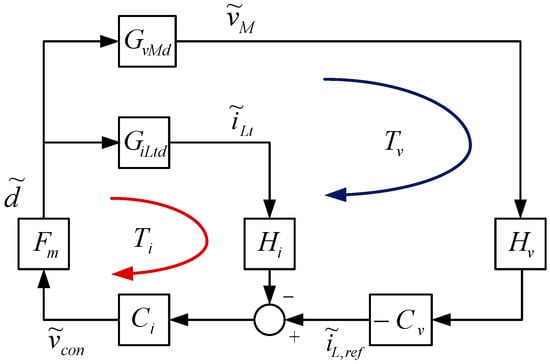 The Block diagram of the closed-loop control scheme is shown in Figure 4. In the inner current control loop, FM is the constant gain of the PWM generator; GiLtd is the transfer function from the duty ratio to the total inductor current (iLt); Ci indicates the transfer function of current controllers; and, Hi is the sensing gain of the current sensor. In the outer voltage control loop, Gvd is the transfer function from the duty ratio to the middle-link voltage (VM); Cv indicates the transfer function of output voltage controller; and, Hv indicates the sensing gain of the voltage sensor.
