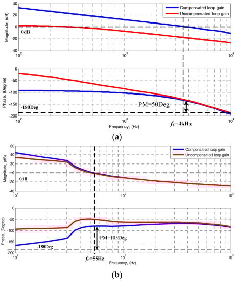 Figure 5a,b show the loop gain frequency response of the compensated current and voltage loops under the full-load condition, respectively. The analyses indicate that 50-degree phase margin and 4-kHz crossover frequency are suitable for the compensated current loop, while the compensated voltage loop is most suitable with 105-degree phase margin and 55 Hz crossover frequency.