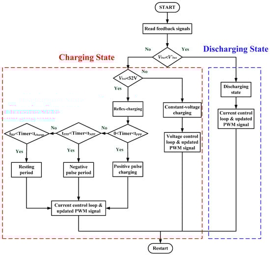 Figure 6 shows the system flow chart. After starting, the system is initialized in order to determine whether the voltage on the DC-microgrid side is lower than the pre-set value. If the pre-set value is higher, the system enters the discharging state where the battery feeds the DC-microgrid. Otherwise, the system will enter the charging state where the battery voltage is compared to the 52 V. If the battery voltage is lower than 52 V, then the reflex-charging operation is executed. Then, staying in the PPP, NPP, and RP is determined using the counter time. Constant-voltage charging is executed when the battery voltage reaches 52 V.