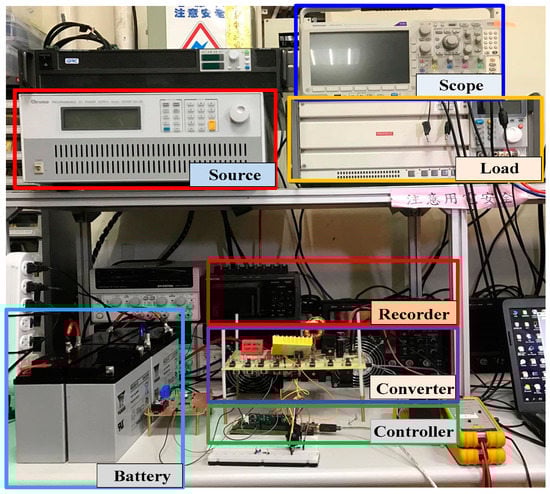 In order to validate the proposed concept, a 500-W bidirectional DC charger system, as shown in Figure 7, is constructed as the test platform. At the low-voltage side of the platform, the voltage is set to 48 V by using four 12 V/22 Ah lead-acid batteries (REC22-12I, Taiwan Yuasa Battery Co., Ltd., Taiwan) connected in series. Lead-acid batteries were chosen due to its low cost and wide usage. For example, valve-regulated lead-acid batteries (VRLAs), such as absorbent glass mat (AGM) batteries and gel batteries, are widely used in micro hybrid electric [22,23,24].