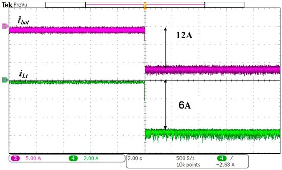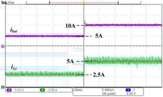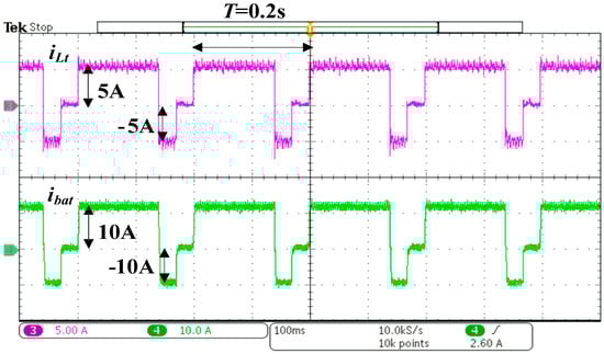 Figure 8 illustrates the transient current control waveform of the proposed bidirectional converter. The figure shows that the battery charging current ibat rises from 5 A to 10 A and the total inductor current iLt rises from 2.5 A to 5 A (100% load). Figure 9 shows the converter waveform in the charging state. The positive charging current ibat = 10 A, whereas the negative discharging current ibat = −10 A. During PPP, the total inductor current iLt is 5 A, and it becomes −5 A during NPP. The reflex charging frequency is 5-Hz and the corresponding duty cycles for PPP and NPP are about 70% and 15%, respectively. Notably, a lot of methods [25,26,27] can be referred to adjust the reflex charging pattern (such as duty or frequency, etc.) for improving the charging efficiencies in future work.