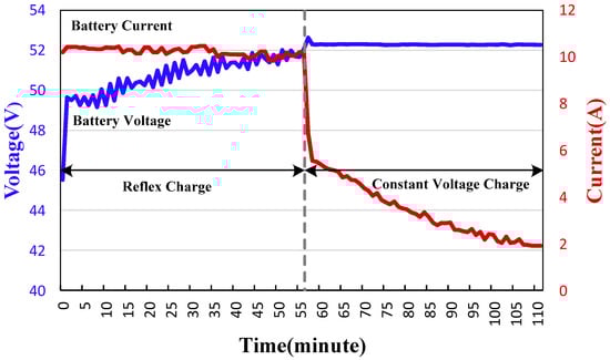 Figure 10 shows the discharging process of the converter, it can be seen that the battery discharging current ibat is −12 A and the total inductor current iLt is −6 A. Figure 11 shows the charging curve of lead-acid batteries, which shows the reflex charging and constant-voltage charging stages. Reflex charging begins at 46 V and constant-voltage charging begins at 52 V. The charging process ends when the battery current drops to 2 A (about 0.1 C-rate). By recording the charging voltage and current of the battery every minute using the recorder, it is determined that the full charging time is 111 min.