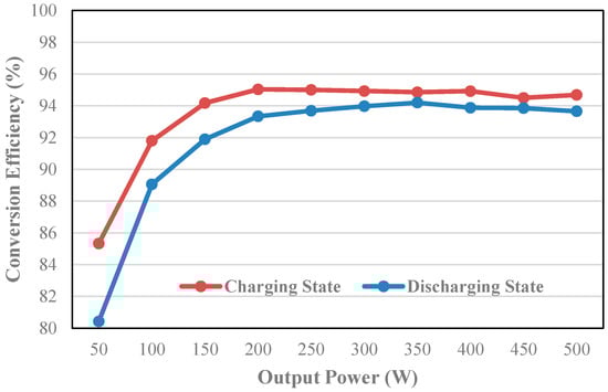 Figure 13 shows the measured conversion efficiency of the proposed high-gain RC-BDC. The result indicates that the maximum efficiency points of charging and discharging states are 95.1% and 94.2%, respectively.
