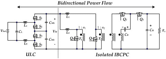 In this study, a high-gain RC-BDC for connecting LEVs to DC-microgrid is proposed. Based on the proposed controller, the high-gain bidirectional converter in [17] was able to achieve both reflex charging and energy recovery. A 500 W test platform consists of a 48-V battery connected to a 400-V DC-bus voltage was built. The experimental results verify the feasibility of the developed concept. In comparison with a typical CC/CV charging profile, the proposed high-gain RC-BDC battery charging speed and the battery thermal deterioration effect improve by about 12.7%, and 25%, respectively. In regards to the conversion efficiency, the experimental results show that the highest efficiencies that were achieved for charging and discharging states are 95.1% and 94.2%, respectively. Finally, it is worth mentioning that the proposed high-gain RC-BDC can be extended to the galvanic isolated configuration by using two high-frequency transformers as shown in Figure 14 for safety insulation requirement and higher voltage conversion ratio applications.