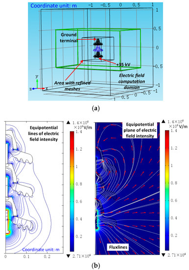 An artificial rectangle boundary was added far away from the insulator string in the simulation model. The electric potential of the boundary was set as 0, regarded as the zero potential reference point of infinite area. Chao et al. [12] concluded that the polarity effect on DC energized insulator contamination can be neglected, so only the positive DC condition is discussed in this paper. According to the operating experience of ±500 kV transmission lines in China, the withstood gradient of insulation height should be over 70 kV/m [14], which means that for each XP-160 (NGK, Osaka, Japan) insulator unit, it needs to withstand at least 11 kV to ensure the insulation strength. Considering this, the high-voltage terminal of the insulator string was set as +35 kV during the simulation, as is shown in Figure 1a. Simulation results of the electric field around insulator string are shown in Figure 1b.