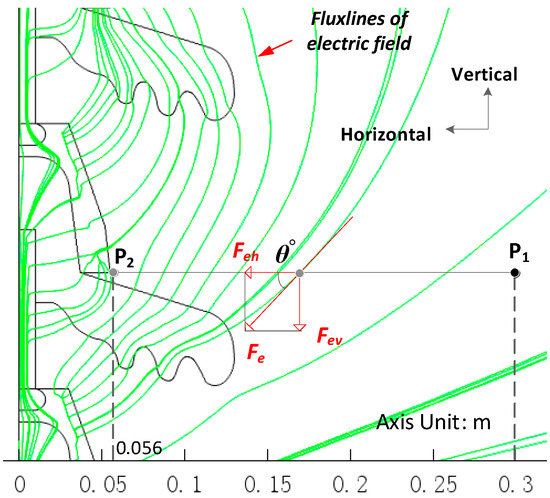 Taking the negatively-charged particles as example, we analyze the electric force characteristics applied to the particles when they approach the surface of the second insulator unit. As is shown in Figure 2, P1P2 is a path that from outer space to the insulator surface. The axis unit is in m. In the figure, Fe, Feh, and Fev are the electric force, the electric force’s horizontal component, and the vertical component, respectively, in N. θ is the intersection angle between the electric force and its horizontal component.
