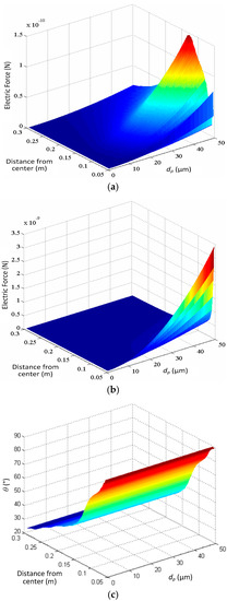 It can be seen from the figure that the horizontal component of the electric force around the insulator surface is within 1.4 × 10−14 N to 1.4 × 10−10 N, while the vertical component is within 5.3 × 10−15 N–3.4 × 10−9 N. The vertical component of the electric force is obviously larger than the horizontal component when the distance is within 0.15 m. For particles with diameters over 20 μm, the electric force increases greatly with dp. θ° is within 23–89° in that path, and the closer to the insulator surface, the larger the angle, meaning that the electric force is almost in the vertical direction, making particles deposit more easily in that direction.