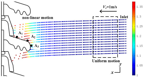 We investigated the effect of the electric field on the particles’ motion ability. The sample points were set as A1, A2, A3, which represent different locations on the insulator surface, as shown in Figure 4. Calculating the changing rate Δvp of the pollution particle velocity caused by the electric field, Δvp is expressed as follows: