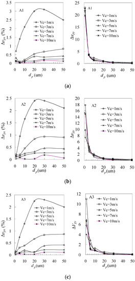 where vp0 is the end speed of the pollution particle when the insulator string is non-energized; vpe is the end speed of the pollution particle when the insulator string is energized with +35 kV DC. The velocity changing rates under different wind speeds and particle diameters calculated by Equation (6) are shown in Figure 5. In Figure 5, Δvpx and Δvpy are, respectively, the horizontal and vertical components of ΔVp.