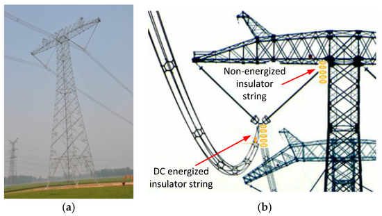 In this paper, the k values for a HVDC line were obtained through field pollution tests. The samples were typical-type suspension porcelain insulators arranged in three different towers from a ±800 kV HVDC line corridor located in a Central China city suburb. The tower views and a diagram of the test samples’ arrangement are shown in Figure 6. The arrangement of the samples and the pollution test procedures exactly followed the guidelines in [18].