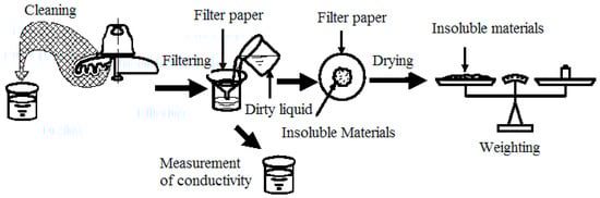 Following the guidelines in [18], ESDD (equivalent salt deposit density, mg/cm2), and NSDD (non-soluble pollution deposit density, mg/cm2) of the samples were measured based on the method shown in Figure 7: firstly, moderately purified water was used to clean up the surface of the polluted insulator, then the conductivity of the dirty liquid after filtering was measured, the salt quantity attached to the top or bottom surface of insulator was calculated separately and, finally, based on the areas of the top and bottom surface, the converse salt quantity to ESDD was calculated; the dirty liquid was filtered after cleaning the insulator, then the insoluble materials left on the filtering paper to dry and were weighed. Lastly, referring to the surface area, the converse of the quantity of insoluble materials to NSDD was calculated.