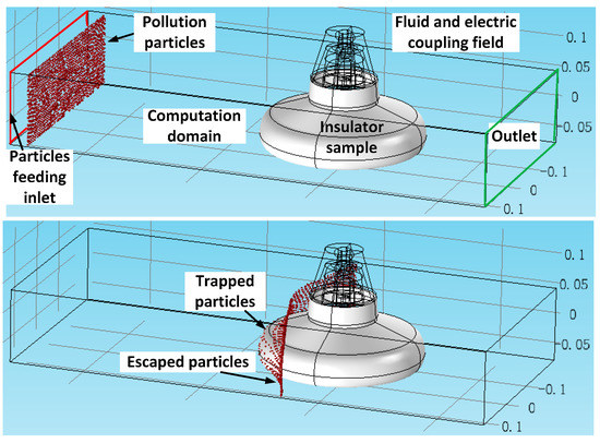 Particle trajectory when moving through the airflow field and the electric field around an insulator.