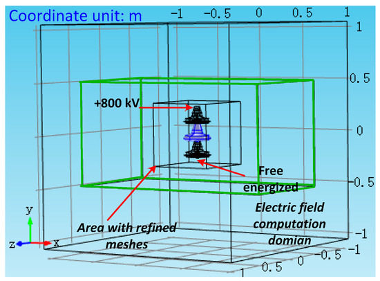 where E is the electric field intensity, in V/m; D is the electric displacement stress, in C/m2; U is the electric potential, in Volts; ε0 is the vacuum permittivity, set as 8.85 × 10−12 F/m in this paper; ε1 is the relative permittivity (for porcelain it is 6 in this paper); and ρ is the density of volume charges, in C/m3.