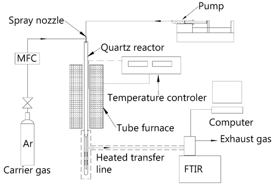 Pyrolysis experiments were carried out using a tube furnace reactor coupled with a Fourier Transform Infrared (FTIR) spectrometer. Figure 1 shows a schematic diagram of the fast pyrolysis system. The reactor was made of a cylindrical quartz tube with an inner diameter of 25 mm and a length of 800 mm. The reactor tube was placed in a vertical tube furnace, the temperature of which was determined by a heating power controller. To ensure that the sample could be sent evenly into the pyrolysis zone, a quartz glass spray nozzle was selected as an entrance of carrier gas and sample solution. The sample solution was sent into the spray nozzle by a piston metering pump, and the solution was sprayed into the reactor under the drive of carrier gas. The experiment was performed in argon, which was used as a carrier gas, as well as the background atmosphere of the pyrolysis. The flow rate of the argon was controlled by the mass flow controller (MFC). Reaction gases were withdrawn from the bottom of the reactor, and then transported into the FTIR system by a heated transfer pipe at 180 °C. A high-performance FTIR (ABB, MB3000) was used for gas analyses. The FTIR spectra were obtained at wavelengths between 450 and 4000 cm−1 and a resolution of 8 cm−1. The FTIR was calibrated before the experiment and simultaneously detects C2H4, CH4, CO, CO2, HCN, HNCO, NH3, NO, NO2, and other gases. A linear relation between a given wave number absorbance (A) and concentration (c) of gas compounds is expected in an ideal case. Gas specific absorptivity (a) is a function of the wavenumber and can be calculated in a standard sample test. The concentration of the test gas is determined according to the Beer–Lambert Law (A = abc) [10,29], where b is the optical path length (cm). The FTIR data are recorded and transformed into the volume concentration of the gas by analyzing the software automatically.