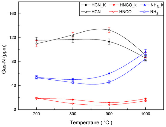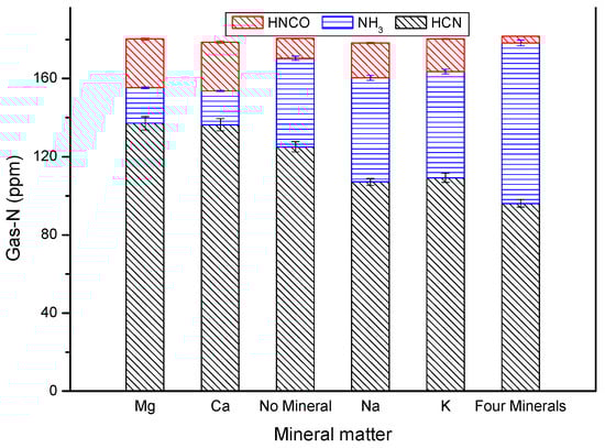 Figure 6 shows that the total amounts of the three nitrogen-containing gases—HCN, HNCO and NH3—exhibit little change after minerals were added into the DKP solution, which is in agreement with observations in the literature [29]. However, the yields of different gaseous products changed significantly. Magnesium and calcium promoted the formation of HCN and HNCO and inhibited that of NH3 [37].
