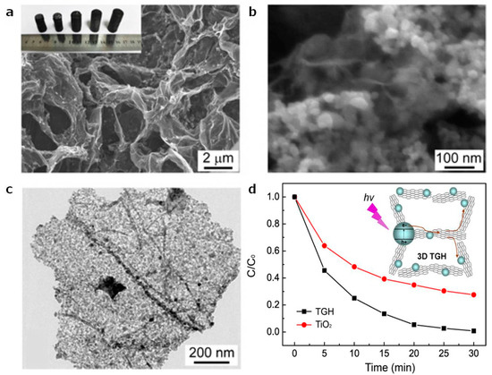Besides the above-mentioned role of graphene as scavenger and transfer media for electrons, GO has the ability to form a 3D structure through various connections including hydrogen bonding, electrostatic force and π–π electron coupling. Liu et al. fabricated a TiO2 NPs-graphene hydrogel (TGH) (Figure 1) by a hydrothermal process. The as-prepared TGH possessed 3D interconnected networks and high surface area, which displayed a synergistic effect of the self-assembled TiO2 NPs and graphene nanosheets. The 3D structure of TGH could significantly enhance the adsorption capacity including physical adsorption and the aromatic dye’s adsorption on the surface of graphene via π–π electron coupling. In addition, the 3D graphene networks could transfer electrons efficiently, leading to a significantly improved photocatalytic activity of methylene blue (MB) (Figure 1d) [19].