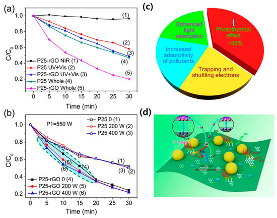 On the specific function of graphene in photoresponse, Wu et al.’s work clarified that the assumption of up-converted photoluminescence (PL) from rGO excited by noncoherent light was artificial [33]. Therefore, it is disputable to attribute enhanced photocatalytic degradation to the up-converted PL. Except the three common traits of rGO in the process of graphene-based semiconductor photocatalysis, which are trapping and transferring of photogenerated charges, increasing adsorption of contaminants and extending light absorption, Wu et al. proposed that the strong photothermal effect (PTE) of rGO is another essential factor influencing the photocatalytic performance. In the study on the degradation of MB, the contribution coming from the PTE in the P25/rGO nanocomposite can be as high as 38% except the common advantages of rGO, as shown in Figure 2b,c. Near infra-red irradiation heats up the rGO sheets because of PTE, which renders a faster movement of electrons with more energy on the hot rGO sheets. As a result, PTE facilitates the photodegradation of contaminants in the TiO2/rGO nanocomposites. Their work indicates that the PTE is of crucial importance in the photocatalysis by graphene-based nanocomposite [20].