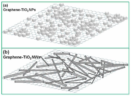 Analogous to 1D TNT, graphene-1D TiO2 nanowire (NW) composite (GNW) is an improvement in respect of morphology-related photocatalytic activity. The most distinct advantage using NWs over NPs is that NWs have a closer interfacial contact with graphene sheet, so as to be uniformly grafted onto graphene by simply considering their geometric scenario (Figure 3). Therefore, the photogenerated electron will transfer from TiO2 to graphene through a very efficient pathway, which promises a higher photocatalytic efficiency. Instead of scattering happening frequently in the NP system, the photogenerated electrons in the NW system gain a direct migration path. According to Fan et al.’s work, TiO2 NWs were distributed more uniformly on rGO than NPs, therefore more NWs have bonded directly to rGO in contrast to the fact that most NPs do not. Furthermore, in the NW system, charge carriers migrate in a linear path, while in the NP system with agglomeration in most cases, migration occurs in a zigzag path. As a result, electron transfer from NW to rGO can be much more efficient than in agglomerated NPs, which restricts the charge carrier recombination in GNW. A significantly improved photocatalytic activity of GNW nanostructure was proved in the photodegradation of MB under solar light irradiation. A synergistic effect of graphene and 1D NW morphology was proposed to explain the enhanced photodegradation [26]. Based on NW morphology, Li et al. prepared a N-TiO2 NWs/N-graphene (N-TiO2/NG) composite by a hydrothermal process utilizing urea as the nitrogen dopant source. N-TiO2/NG exhibited improved photocatalytic performance under visible light irradiation. The overlap of the N2p energy level of N dopant and the O2p (VB maximum) reduces the energy gap an electron needs to surpass to be injected into CB of N-TiO2/NG [38].
