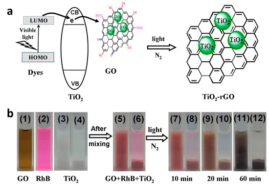 - Wang, P.; Wang, J.; Ming, T.S.; Wang, X.; Yu, H.G.; Yu, J.G.; Wang, Y.G.; Lei, M. Dye-sensitization-induced visible-light reduction of graphene oxide for the enhanced TiO2 photocatalytic performance. ACS Appl. Mater. Interfaces 2013, 5, 2924–2929. [Google Scholar] [CrossRef] [PubMed]