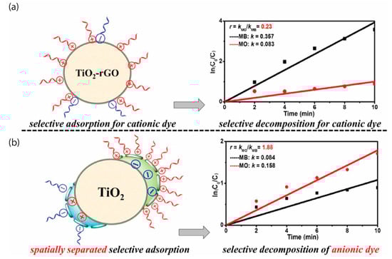 Schematic diagram illustrating (a) the adsorption behaviors of cationic and anionic dyes on TiO2 surface and corresponding decomposition rate of the MO-MB solutions; (b) the controllable selective adsorption of cationic and anionic dyes and corresponding decomposition rate (Reprint from [47] with permission from the American Chemical Society. Copyright 2016).