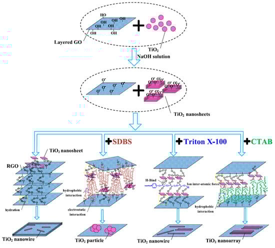 The functionalization of graphene-based material with surfactant is multiple. For example, there were reports about graphene sheets’ functionalization by the surfactant molecules [51,52,53]. The work by Martín-García et al. especially pointed out that the utilization of a zwitterionic surfactant N-dodecyl-N,N-dimethyl-3-ammonio-1-propanesulfonate (DDPS) was able to improve the reduction efficiency in the reduction process of GO to rGO. Besides, the introduction of DDPS increased the conductivity of rGO without altering the carbon work [51]. As for TiO2/Graphene-based composite, the modification with surfactant is an effective method to control their morphologies and structures. Xin et al. synthesized a TiO2/GO nanocomposite with a flower-shaped structure with the assistance of sodium dodecyl benzene sulfonate (SDBS) as the surfactant [11]. In Wu et al.’s work, cetyl trimethyl ammonium bromide (CTAB) was used as a cationic surfactant to synthesize TiO2/rGO nanocomposite with a novel morphology (Figure 7). Besides, SDBS and Triton X-100 were used as surfactant to regulate the phase structure and morphology of TiO2/rGO composites as well, leading to TiO2 NPs and distributed NWs respectively. With array-like TiO2 nanowires grown on the surface of rGO, TiO2/rGO-CTAB displayed an excellent photocatalytic efficiency to remove almost all of the MB molecules. Surfactant-assisted hydrothermal method was proved to be an effective approach to improve the structure, morphology and photocatalytic performance of TiO2/rGO composites [54].