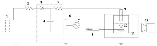 The experimental system included the power supply (50 Hz AC and DC), oscilloscope, vacuum test chamber, and high-speed camera, as shown in Figure 1. Where 1 is the 50 Hz power frequency testing transformer, 2 and 5 are protected resistors, 3 is a HV diode, 4 is a HV capacitor, 6 is the potential divider, 7 is the oscilloscope, 8 is a syringe, 9 is a bushing, 10 is the electrode system that was immersed in the oil tank with dimensions of 35 cm × 20 cm × 20 cm, 11 is the vacuum test chamber (the dimensions of the vacuum test chamber are 60 cm × 50 cm × 40 cm), and 12 is high-speed camera, and the model of the high-speed camera is FASTEC-IL5, produced by Rocky Mountain High Speed, with a frame rate of 1000 frames per second.