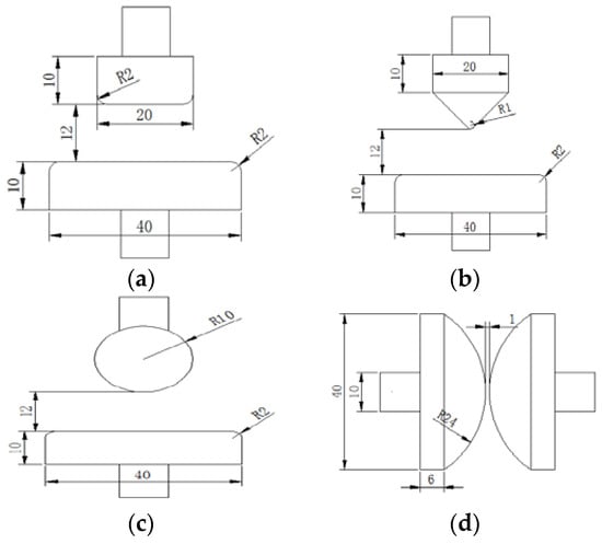 The schematic diagram of the electrodes (mm). (a) cylinder-plan electrodes; (b) cone-plan electrodes; (c) sphere-plan electrodes; and, (d) sphere-sphere electrodes used for the investigation of the breakdown voltage of the pressboard.