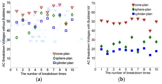 From Figure 3b, the breakdown voltages of the cone-plan electrodes with bubbles are much more than the breakdown voltages of the other two types of electrodes, and the breakdown voltages of the sphere-plan electrodes are more than the cylinder-plan electrodes. The average value of the breakdown voltages of the cone-plan electrodes is 49.4 kV, the average value of the breakdown voltages of the sphere-plan electrodes is 25.3 kV and the average value of the breakdown voltages of the cylinder-plan electrodes is 18.0 kV.