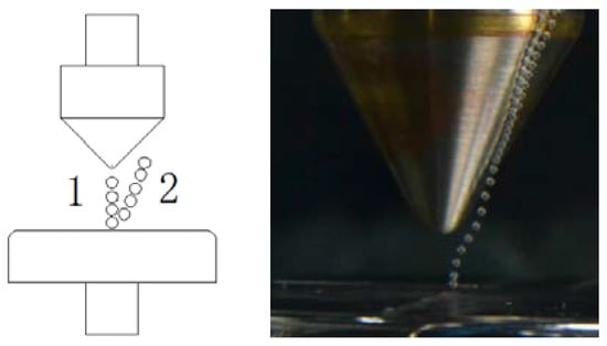 The bubbles of the cone-plan electrodes, where 1 are the initial bubbles; 2 are the bubbles affected by the electric field. The left picture is the schematic diagram and the right one is the real photo of the bubbles affected by the electric field.