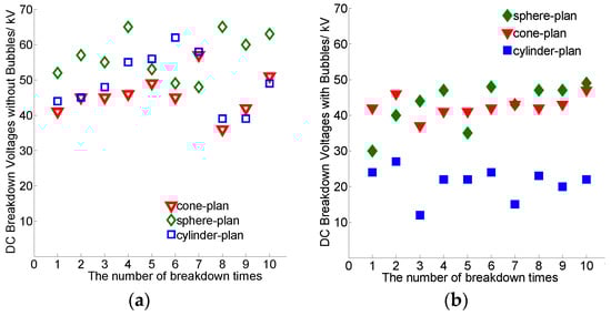 From the above, with the influence of the bubbles, the breakdown voltages of the cone-plan electrodes have a 7.2% decrease on average; the bubbles have led to a 24.1% decrease in the value of The average breakdown voltage for the sphere-plan electrodes; and also the bubbles have led to a 66.9% decrease in the value of The average breakdown voltage for the cylinder-plan electrodes. The results showed that under a DC voltage, the bubbles would also decrease the breakdown voltages for all the electrodes, and the reduction of the cylinder-plan electrodes’ breakdown voltages were the most serious, and the cone-plan electrodes had minimal effects. However, the sphere-plan electrodes saw a minor reduction than that of the AC condition.