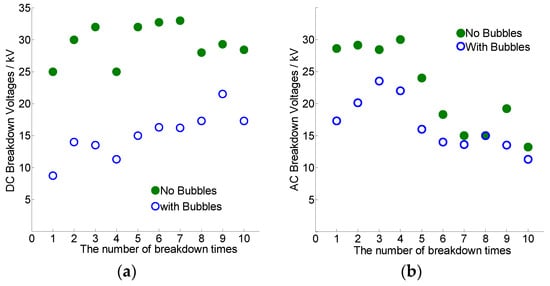 The AC breakdown voltages (effective values) of the transformer oil. (a) The AC breakdown voltages of the oil without bubbles; and, (b) the AC breakdown voltages of the oil with bubbles.
