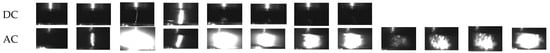 From Section 3.1, it is can be seen that the discharge progress was influenced by the movements of the bubbles: if the bubbles were easy to link the two electrodes, the breakdown voltage would see a sharp decrease. Under the DC electric field, the bubbles were easy to charge, and they would then obtain an electric force with constant direction that made the bubbles move faster than under the AC condition. For that, the bubbles would move from the plan electrode to the other electrode with a higher speed under the DC condition, and this progress made it difficult for the bubbles to link the two electrodes, especially in the non-uniform electric fields, like the electric field of the cone-plan electrodes, the existence of the corona would make the bubbles’ bridge more difficult to form.