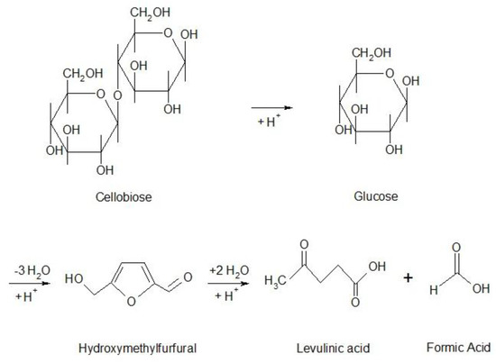 Saccharification of lignocellulosic biomass with an acid catalyst is also possible. The main objective of acid treatment is the solubilization of hemicellulose and making cellulose accessible to enzymes. Acid hydrolysis is an alternative for enzymatic hydrolysis, as acid hydrolyzes biomass to fermentable sugars. However, intensive washing is required to remove the acid before fermentation is performed. The advantage of using acids is their low price and availability. Additionally, the use of organic acids (formic, acetic, maleic) makes the process environmentally friendly [20]. The disadvantage is the need to neutralize the used acid by alkali, which generates a stream of reagents, or by vacuum distillation, in order to reuse the acid. Another disadvantage of using acid hydrolysisis is the possibility of the formation of fermentation inhibitors, especially when high acid concentrations, high temperatures, and long reaction times are applied [21,22]. During acid hydrolysis, the acid catalyzes the breakdown of glycosidic bonds between sugar residues, followed by the breakdown of released glucose to form hydroxymethylfurfural (HMF), formic acid (FA), and levulinic acid (LA) (Figure 1) [23]. Compounds, such as furfural, 5-HMF, and phenolic compoundsaffect the microorganism metabolism in the fermentation step. Dilute acid pre-treatment is more favourable for industrial applications due to the reduction of the operational and maintenance costs(corrosion problems). Additionally, this kind of pre-treatment generates fewerdegradation compounds than the concentrated acid pre-treatment [18,24,25].