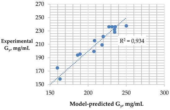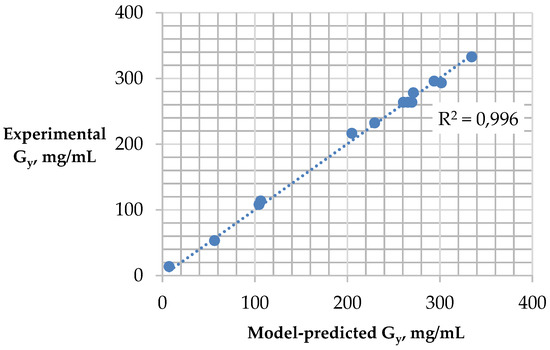 In Equation (2) X1, X4, and X5 represent sodium hydroxide concentration, Viscozyme L content, and the time of enzymatic hydrolysis, respectively. Y denotes a glucose yield. Equation (2) enables the calculation of the theoretical glucose yield within the range of variables according to boundary conditions. In order to obtain Equation (2), the least significant parameters were rejected in the consecutive iterative steps. It turned out that the least important parameters are: NaOH concentration, duration of enzymatic hydrolysis, and the ratio of enzymes raised to the square. Equation 2 is described by the model parameters contained in Table 6. Based on the analysis of variance, the obtained value of the determination coefficient (R2 = 0.934) indicates a good correlation of the results calculated from the equation with the experimental results of glucose efficiency (Figure 6).