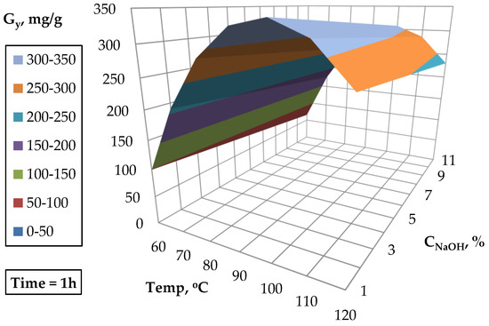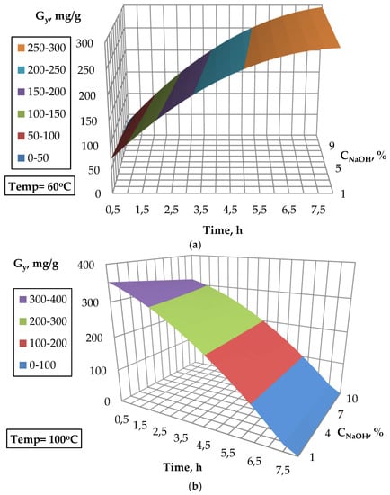 Figure 4 shows the effect of temperature and duration time of acid hydrolysis on the glucose yield for a constant sodium base concentration (6%). Glucose efficiency increases with increasing temperature, however, when the optimal temperature (100 °C) is reached, a significant decrease in glucose efficiency is observed if the temperature is further increased. For temperaturesin the range of 90–100 °C, and for a short time of acid hydrolysis (0.5 h), the highest glucose yields are obtained. An increase in time over 0.5 h results in a decrease in the hydrolysis efficiency. Only for the temperature of 60 °C, an increase in glucose efficiency along with the duration time of acid hydrolysis is observed.