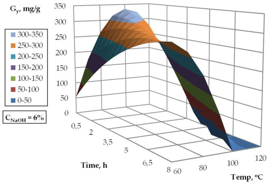 For the analysis of the influence of input variables on the result of two-stage hydrolysis, i.e., alkaline treatment and acid hydrolysis, experiments (Table 3) were performed according to the Box-Behnken design for three variables. The following boundary values were assumed for the investigated variables: concentration of NaOH 1–11% at a constant temperature of 65 °C and alkaline pre-treatment time of 6h, duration of acid hydrolysis of 0.5–8 h, and the temperature of acid hydrolysis of 60–120 °C. As an output parameter, glucose yield (Gy) was selected as a parameter describing the efficiency of the process. Additionally, Table 3 shows the obtained values of the sum of reducing sugars.