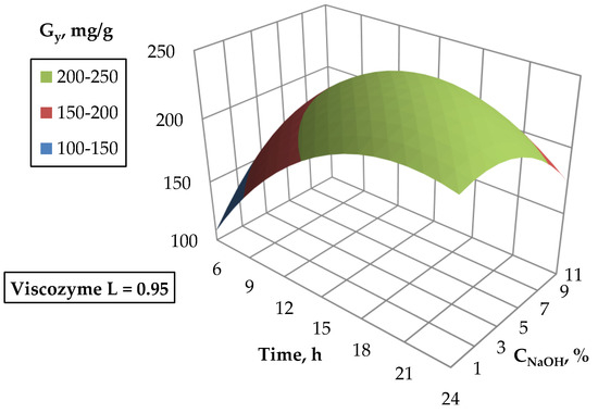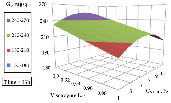 Figure 8 presents changes in glucose efficiency for enzymatic hydrolysis carried for Viscozyme L content of 0.95. Based on the course of the response surface it can be stated that for the change in NaOH concentration, a local maximum around 7–9% is observed. Obtained results confirm that 9% NaOH concentration is an adequate concentration of alkaline catalyst chosen as the optimal value. A relationship between time and glucose yield during enzymatic hydrolysis show that an increase of the hydrolysis time above 16 h is no longer reasonable. It was decided that the optimal time of enzymatic hydrolysis is equal to 16 h for Viscozyme L content of 0.95 and 9% concentration of NaOH.