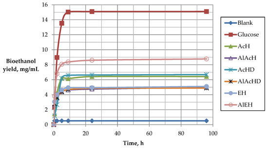 In addition, fermentation was carried out on acidic hydrolysates after the removal of fermentation inhibitors. Despite effective detoxification, no significant increase in ethanol yield was obtained. For the fermentation of AcHD hydrolysate, 0.3 mg/mL more ethanol was obtained than for AcH, while for AlAcHD, the increase in ethanol was even smaller and was only 0.1 mg/mL more than for the AlAcH fermentation.