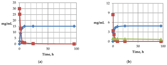 The results of fermentation on hydrolysates (Figure 11) indicate that glucose is completely digested within the first 5 h of the process. During the fermentation of AlEH and EH hydrolysates, cellobiose is also digested, however, a significant loss of concentration of this disaccharide is observed only after complete consumption of glucose. Additionally, xylose undergoes digestion only after the complete digestion of glucose by yeast. Total xylose consumption was observed after 24 hours of fermentation. The order of sugar digestion described above is confirmed by other papers indicating that digestion of xylose by Saccharomyces cerevisiae is possible only after complete consumption of glucose [3]. Interestingly, the yeast Saccharomyces cerevisiae D5A, during the fermentation of hydrolyzed trunks of palm trees, was not able to digest xylose [6].