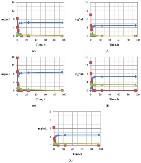 Courses of bioethanol fermentation presenting bioethanol yield (blue) and consumption of glucose (red) and xylose (green) in function of time from following substrates: (a) pure glucose; (b) AcH; (c) AlAcH; (d) EH; (e) AlEH; (f) AcHD; and (g) AlAcHD.