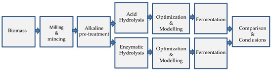 The experiments described in this paper were realized according to the general scheme presented in Figure 12. Symbols of variables are given in accordance to those used in Table 4 and Table 7. Experiments regarding the conditions of alkaline pre-treatment, as well as acid or enzymatic hydrolysis, were planned and realized according to Box-Behnken design for three factors. Table 10 presents the input variables for a given coding level.