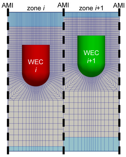 In order to simulate multiple independently moving WECs in an array configuration, arbitrary mesh interfaces (AMIs) are implemented in order to create sliding meshes (see dashed vertical lines in Figure 4 for the case of two WECs). These AMIs define a zone of cells around each WEC. In each zone, only the lowest and highest row of cells (see blue shaded boxes in Figure 4) are expanded or compressed according to the motion of the WEC located in that zone. This methodology is implemented to prevent undesirable mesh deformations around the interface between water and air (i.e., high non-orthogonality and skewness of the computational cells). As a disadvantage, high aspect ratios are obtained for the distorted cells. However since those cells are not inside the zones of interest, it does not affect the accuracy of the simulations. All the variables solved with the fluid solver, such as velocity, pressure and volume fraction, are interpolated over the AMIs.