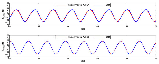 Figure 5 presents the wave-induced surge (horizontal) forces acting on WEC4 and WEC5 as a function of time. The red line indicates the experimental data while the blue line depicts the numerically obtained force by the CFD fluid solver. Note that the noise in the time signals of the experimental force measurements has been filtered out using a bandpass filter. An outstanding agreement is observed between the numerical and experimental data which is also confirmed in Table 2 by relative errors equal to 7% and for WEC4 and WEC5 respectively. This achievement is a necessary requirement for the simulations with heaving WECs later in this study because the wave-induced force acting on a floating body determines its kinematic motion.