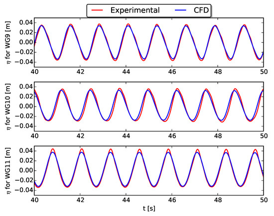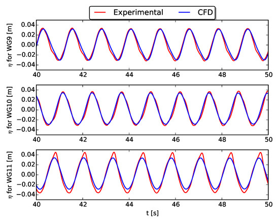 Perturbed wave field using WG9, WG10 and WG11 (see Figure 2) around the heaving 2-WEC array during a regular wave test ( m, s, m) obtained with CFD (blue line) compared to the experimental data (red line).