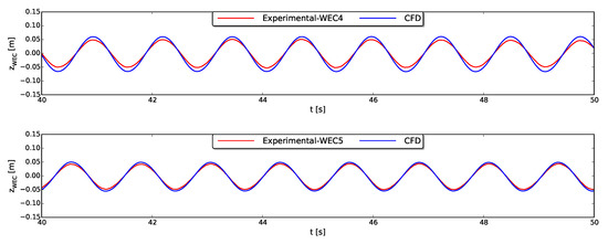 Vertical position of WEC4 (top) and WEC5 (bottom) obtained with CFD (blue line) compared to the experimental heave motions (red line).