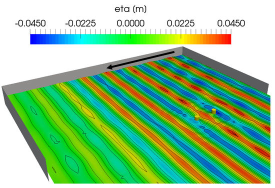 A good agreement is also found when comparing numerical and experimental data for the perturbed wave field around the 5-WEC array (Figure 14). However, some discrepancies are observed regarding the time series of the surface elevations in the wave basin, in particular for the maximum and minimum surface elevations. Figure 15 depicts a snapshot of the perturbed wave field at s. Similar to Figure 9, waves are generated and absorbed at the right and left boundary respectively. Again, the reduced wave height behind the 5-WEC array near the outlet boundary is due to the increasing aspect ratio of the grid cells leading to numerical wave damping. In a local zone near the array, a significantly perturbed wave field is predicted by the numerical model. Due to a perturbed wave field near the array, the numerically predicted heave motions for the individual WECs are not uniform (see the blue lines in Figure 12). Furthermore, an important reduction in wave height is observed right behind the array.