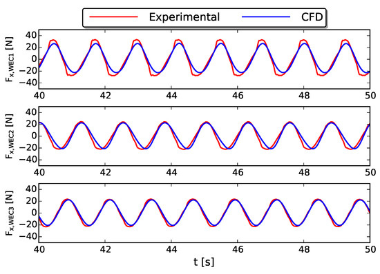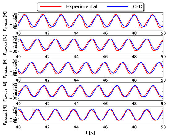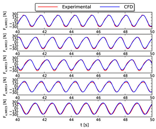 Figure 10 depicts the wave-induced surge force on the five fixed WECs as a function of time for both numerical (blue lines) and experimental data (red lines). Again, the numerically obtained surge forces are in a very good agreement with the experimental data and show relative errors of maximum in Table 2. The time signals also reveal that the maximum and minimum surge force on the WECs is independent of the WEC’s position in the array and wave basin. This is also confirmed by comparing Figure 5 (2-WEC array) and Figure 10 (5-WEC array) showing identical loading cycles on the fixed WECs.